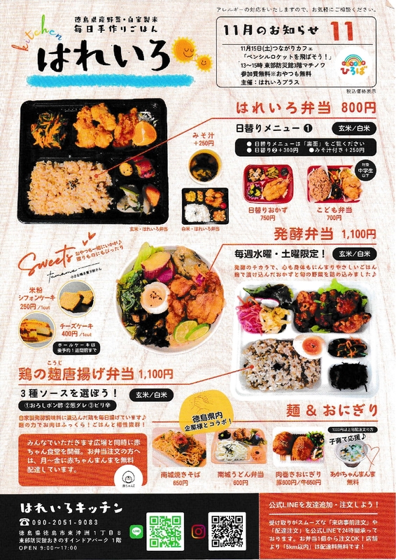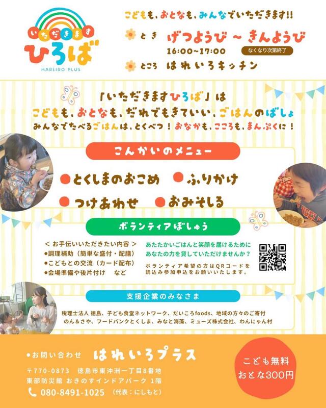 徳島市マリンピア沖洲内の「東部防災館おきのすインドアパーク(1階)にて、団体「はれいろプラス」が運営する子ども食堂です。